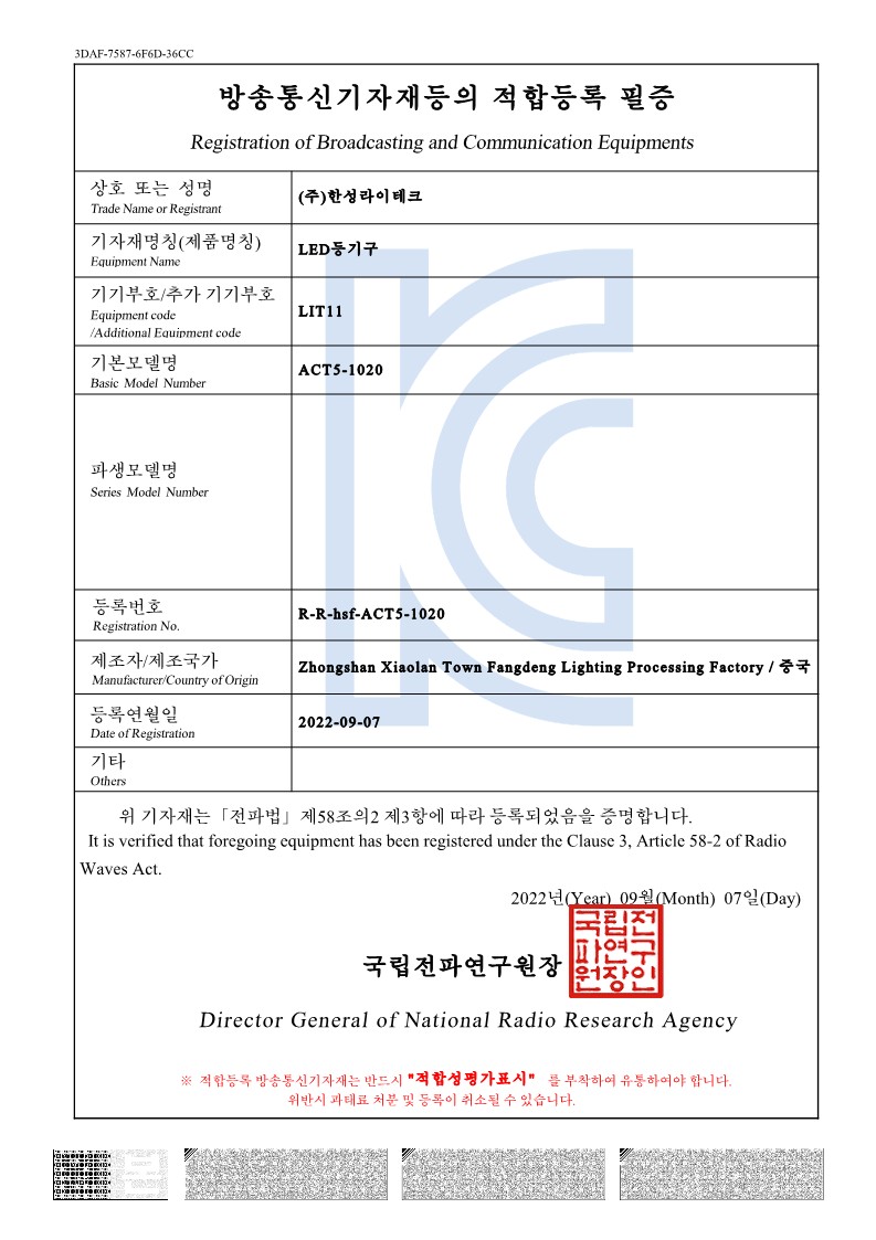 HSFL-HI-640640-57K-40W 직하평판 고효율인증서