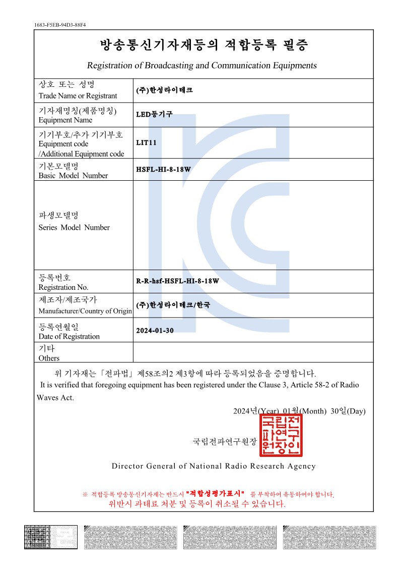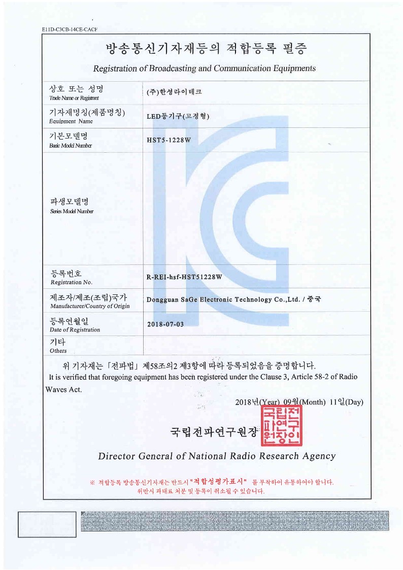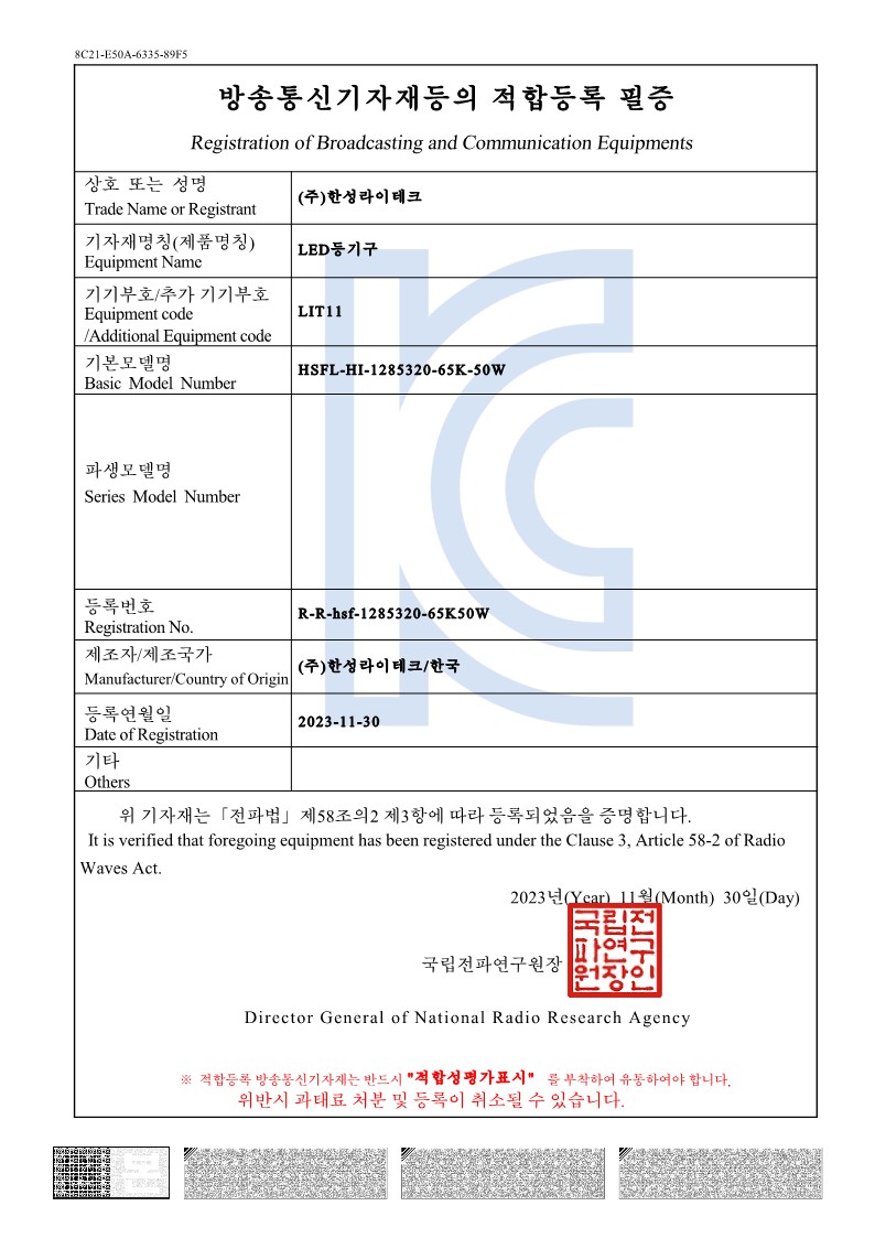 HSFL-HI-1285320-65K-50W 직하평판 고효율인증서