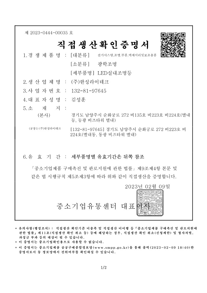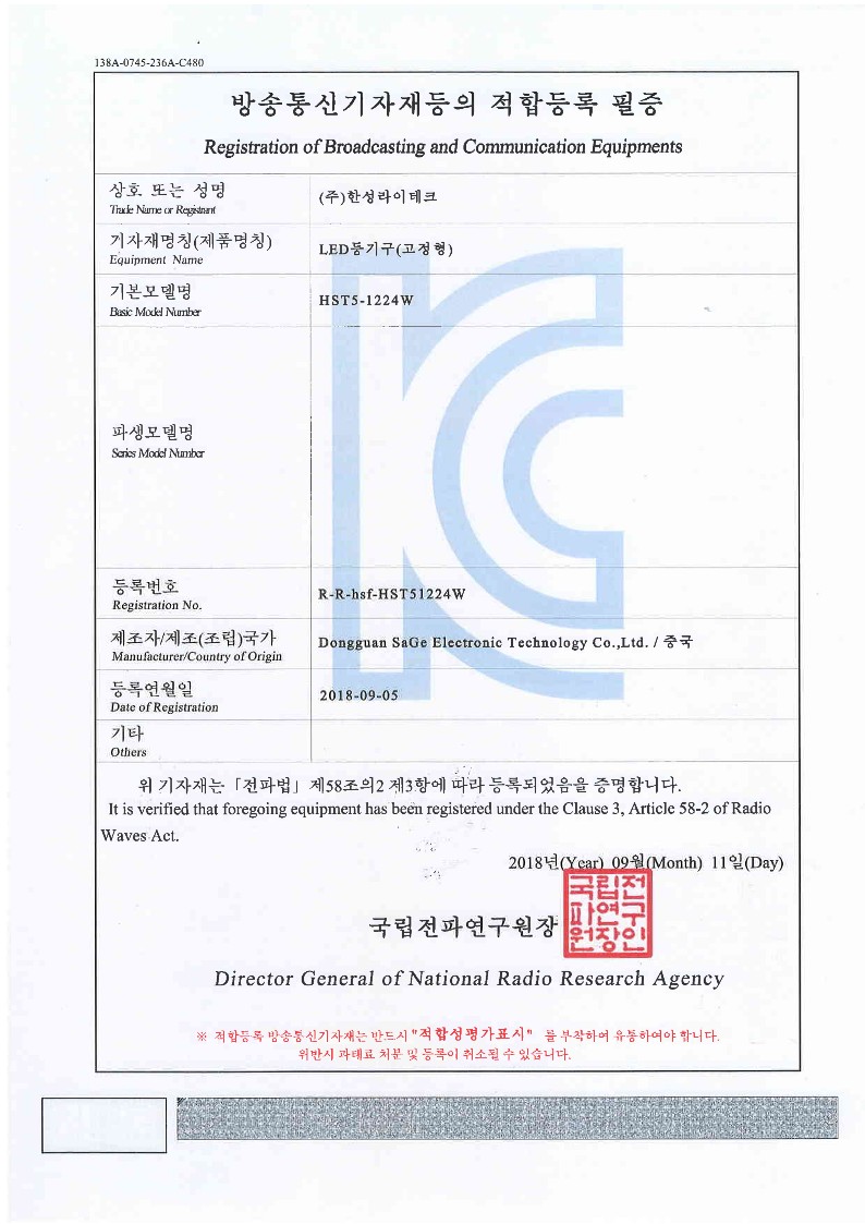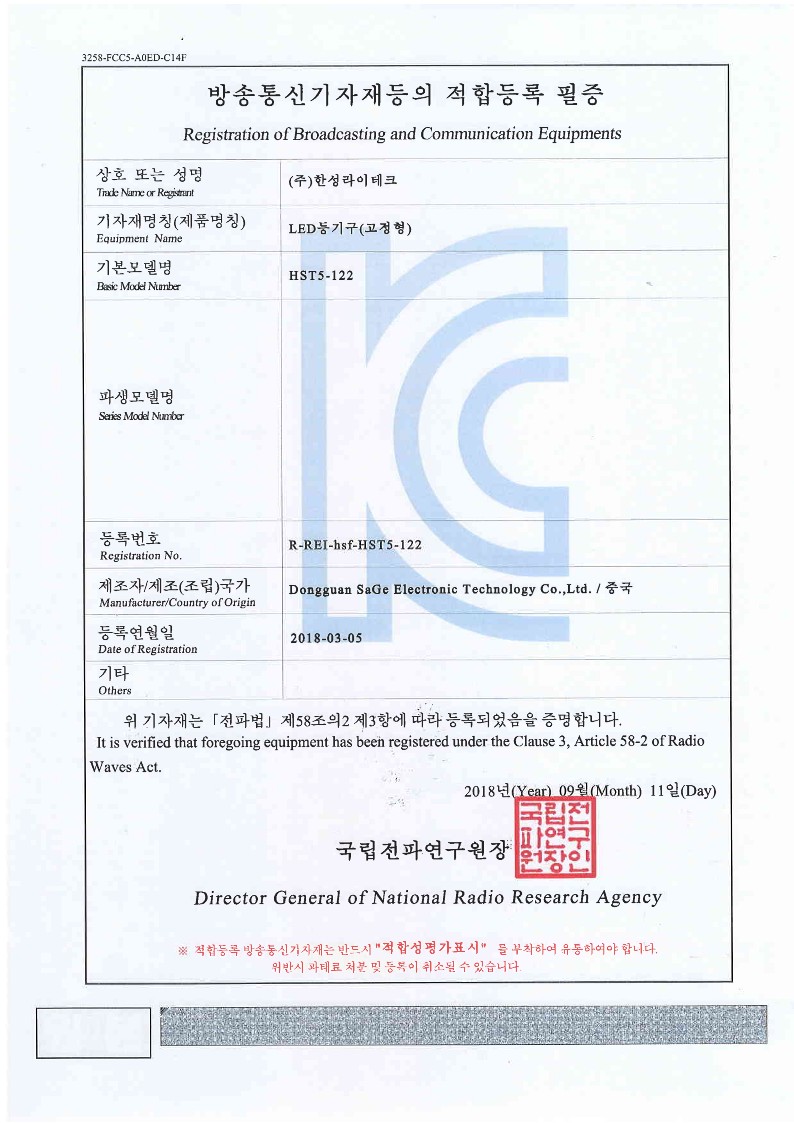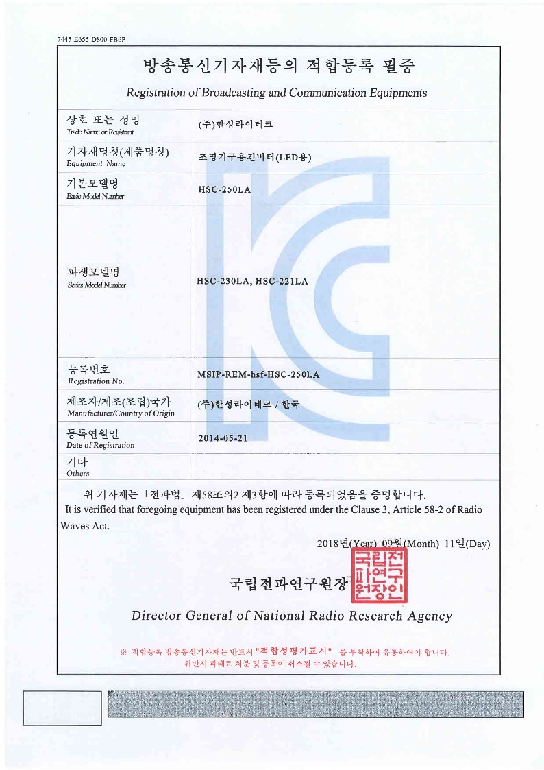 HSFL-HI-1285320-65K-50W 직하평판 고효율인증서